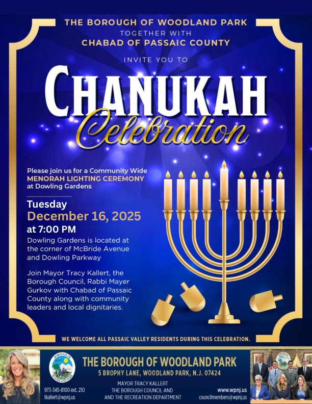 Join The Borough of Woodland Park together with Chabad of Passaic County for our Community-Wide Menorah Lighting Ceremony!